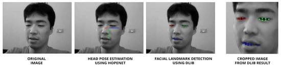 First, face detection is required to locate and size human faces in images [34,35]. Most studies use the Viola–Jones algorithm to perform face detection [36]; however, it cannot detect the top and bottom points of the eyelids and the top and bottom inner lips of the mouth. The proposed method uses Dlib, a robust frontal face detector capable of out-putting 68 facial landmarks based on a Histogram of Oriented Gradients (HOG) alongside a linear SVM classifier. These landmarks are crucial to obtaining the key points in the human face that make each individual different [37], as facial components and contours differ from one person to another [38]. These landmarks were used to calculate the eye and mouth openings by measuring the distance between specific landmark points. The distances are then used to compute PERCLOS and POM. Furthermore, the facial landmarks detected using Dlib are also frontalized using a frontalizing method from Ref. [39] to create normalized landmarks for each result of facial landmark detection. This was performed to create normalized landmarks to provide consistent and reliable data.