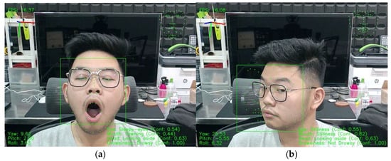 Sample pictures taken from webcam simulation. (a) Sleepy eyes and yawning are detected as a drowsy subject; (b) stillness of eyes and stillness of mouth while head is looking aside are detected as not drowsy.