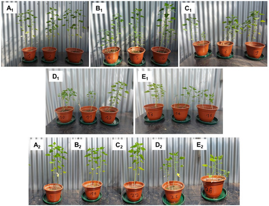 Pot assay with quinoa (examples). (A1): Control soil; (A2): Control soil + HANPs; (B1): Soil + Cd (5 mg kg−1); (B2): Soil + Cd (5 mg kg−1) + HANPs; (C1): Soil + Cd (10 mg kg−1); (C2): Soil + Cd (10 mg kg−1) + HANPs; (D1): Soil + Cd (25 mg kg−1); (D2): Soil + Cd (25 mg kg−1) + HANPs; (E1): Soil + Cd (50 mg kg−1); (E2): Soil + Cd (50 mg kg−1) + HANPs.