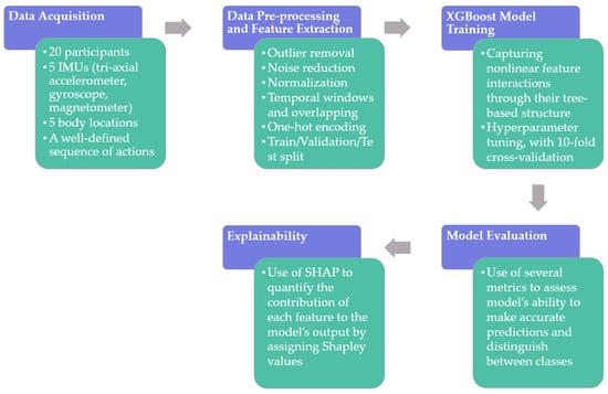 The predictive model used in this study was XGBoost, which is an optimized implementation of gradient boosting designed for speed and accuracy, making it particularly suitable for tasks involving large, complex, and noisy sensor data with many features, including data taken using accelerometers, gyroscopes, and magnetometers. XGBoost models are adept at capturing nonlinear feature interactions through their tree-based structure [49]. The primary reason, however, for selecting XGBoost in this analysis was that it additionally integrates seamlessly with SHAP, allowing for an in-depth analysis of feature contributions by considerably reducing the complexity of calculations [32,33], as will be elaborated next.