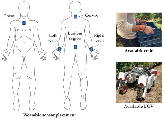A visual representation of the wearable sensors’ placement on the human body along with the available crate and unmanned ground vehicle (UGV) used in the experimental sessions.