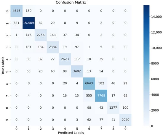 By employing confusion matrices, the performance of the ML model can be effectively visualized and evaluated, providing a clear representation of classification accuracy by showing the counts of true positives, false positives, true negatives, and false negatives for each class. In the present study, the confusion matrix shown in Figure 3 is of a 10 10 size, where 10 is the number of classes (activities) to be predicted. As can be inferred by the diagonal dominance, the proposed ML model indicates substantial performance. However, there are some misclassifications, like that between Class 0 (standing still) and Class 1 (walking without a crate). Furthermore, as expected, misclassifications are observed mainly between similar activities involving either a full or empty crate (i.e., (a) bending to approach an empty/full crate; (b) lifting an empty/full crate; (c) walking with an empty/full crate; and (d) placing an empty/full crate onto the UGV).