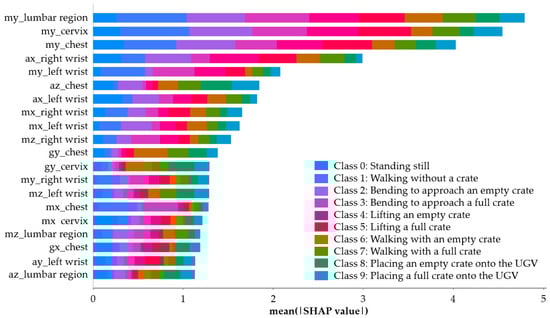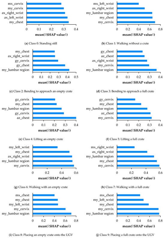 In this section, we delve into class-specific feature importance, focusing on the contributions of different sensor features for each individual class. Although this class-specific information is partially given in Figure 4, we examine each class separately for the sake of clarity. The SHAP variable importance plot ranking of the top five model features in decreasing order of contribution for Classes 0–9 is provided in Figure 5a–j. For “standing still” (Figure 5a), the most influential feature, namely, “my_chest”, in conjunction with “my_cervix” and “mx_cervix”, contributes significantly to the model’s classification, likely due to the stable data provided by the chest sensor for this static activity. However, the wrist sensors, “ax_left_wrist” and “ax_right_wrist”, are also important, displaying that while “standing still” is a low-movement activity, wrist sensors can still provide valuable information when paired with other body sensor data. For instance, they can help distinguish between “standing still” and other activities that involve similar body positions but different arm movements or body stances, which would be subtle in nature but impactful for classification. For the “walking without a crate” activity (Figure 5b), the top five features are “my_cervix”, “my_chest”, “my_lumbar region”, “ax_right_wrist”, and “mx_left_wrist”. These features highlight the importance of sensors placed on the torso, mainly magnetometers, as they are crucial for capturing body movements during walking, while also, wrist sensors can capture arm swinging [63], a significant characteristic of walking.