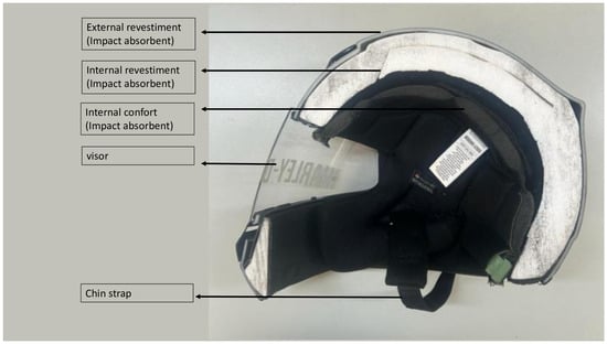 A motorcycle helmet is a vital piece of safety equipment composed of several components, including the shell, inner liner, comfort liner, chin strap, and visor, as illustrated in Figure 1 [3]. This investigation will focus on the inner lining, commonly called the protective padding. This component is typically made of expanded polystyrene (EPS) due to its soft, cushioning properties and robust structure designed to absorb impacts and minimize injuries [4].