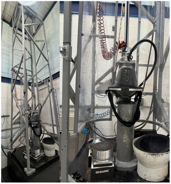 To ensure appropriate parameters for statistical analysis, the composites were subjected to impact testing in a randomized order. Each composite was placed on the standard flat base of the MAU 1006 testing machine, and the machine’s integrated computer system released the test head in a controlled manner. Due to the destructive nature of the test, each sample experienced a single impact at point P, ensuring that each test accurately reflected the impact absorption capacity of the composite (Figure 5).