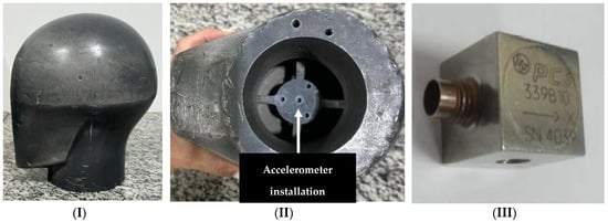 (I) Impact head; (II) center of gravity of the head; and (III) triaxial accelerometer.