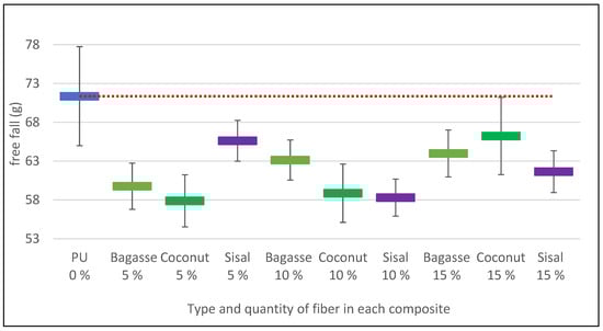 All stages of the composite fabrication were conducted in a controlled-temperature environment (25 °C ± 5 °C), adhering to a total curing time of 48 h as recommended by the manufacturer prior to the impact absorption tests. The testing was performed at the Product Testing Laboratory (Laboratório de Ensaios em Produtos) (LAENP) of the National Institute of Technology in Brazil. To assess the variability of the results, ten replicates of each composite were produced, except for the 15% sisal composite, for which thirty replicates were formulated based on preliminary statistical analysis.