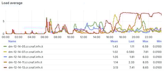 The load average section in the INFN-CNAF dashboard. Each plot of a particular color represents the load average values related to the specific host indicated in the “Name” column.