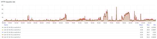 The HTTP request rate section in the INFN-CNAF dashboard. Each plot of a particular color represents the HTTP request rate related to the specific host indicated in the “Name” column.
