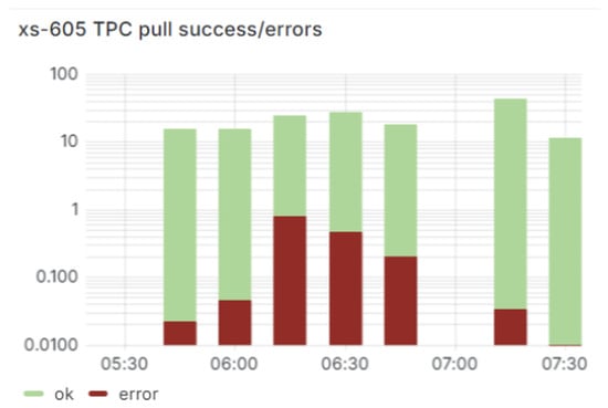 Example case 1—anomaly visible via the “TPC pull success/error” metric, which represents the success or failure rate of data transfer operations using the TPC (Third-Party Copy) protocol.