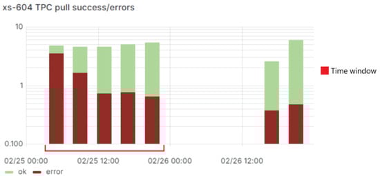 The criterion for distinguishing between normal and anomalous situations was determined through a detailed analysis of dashboard metrics and discussions with INFN-CNAF system technicians. A consistent anomaly pattern was identified: during system crashes or malfunctions, the “TPC pull success/error” metric exhibited a clear interruption in data reception. This interruption, as illustrated in Figure 4, was visually evident as a gap in the metric’s graphical representation.