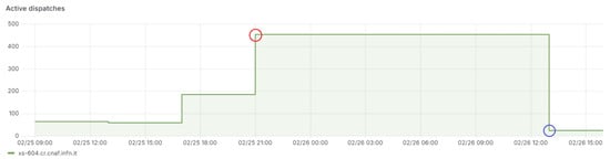 The anomaly in question was examined by analyzing the metrics displayed on the INFN-CNAF dashboard in order to understand its causes and identify the reason for the detected anomalous behavior. Observing the metrics on the dashboard for the time period associated with the identified anomaly, illustrated in Figure 5, it becomes evident that the anomaly originated from an increase in active dispatch requests to manage, as shown in Figure 6. An increase in active dispatches indicates a rise in the number of requests that the system must assign to various processes or computation nodes for processing. The sudden and consistent increase in these requests gradually saturated the system’s resources, preventing it from effectively handling the workload. Consequently, a critical overload occurred, leading to a temporary shutdown, interrupting services and preventing the system from responding correctly to future requests. In Figure 6, the moment when the system reached saturation and caused a crash or temporary shutdown is highlighted with a red circle. This coincides with the last time we received data from the metric measuring the TPC pull success/error requests, shown in Figure 5. A blue circle also highlights the point when the system was restarted and resumed normal operation.