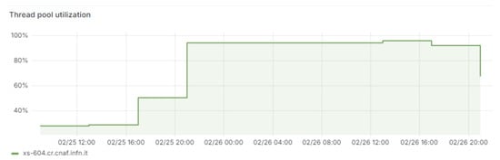 This overload is confirmed by observing another metric, namely, the thread pool utilization, as shown in Figure 7. Indeed, the graph clearly shows a gradual and consistent increase in thread pool utilization, starting from about 20% and reaching 100%, indicating full saturation of the available computational resources. The constant increase and subsequent saturation of thread pool utilization coincide with the peak of active dispatches observed earlier, confirming that the increase in requests led to an overload of the available resources, resulting in a system crash.