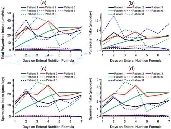By considering the daily volume administered and the polyamine content of the EN formula given to each patient, we calculated the total daily intake of polyamines (Figure 1a), putrescine (Figure 1b), spermidine (Figure 1c), and spermine (Figure 1d) for each patient.