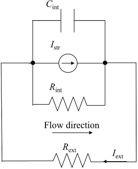 Based on the framework developed by Mansouri et al. [14], the core elements of the electrical analogy consist of an internal capacitor (), a streaming current source (), and the device’s internal resistance (), which are arranged in parallel. represents charge accumulation within the electrical double layer of the microchannels. is generated by ion transport, driven by pressure difference caused by evaporation. accounts for ion transport resistance along the channels. The complete electrical analogy, including the external load resistance () and external current (), is illustrated in Figure 1. This simplified electrical analogy effectively highlights the characteristics of the electricity output, capturing the practical aspects of power generation within the device.