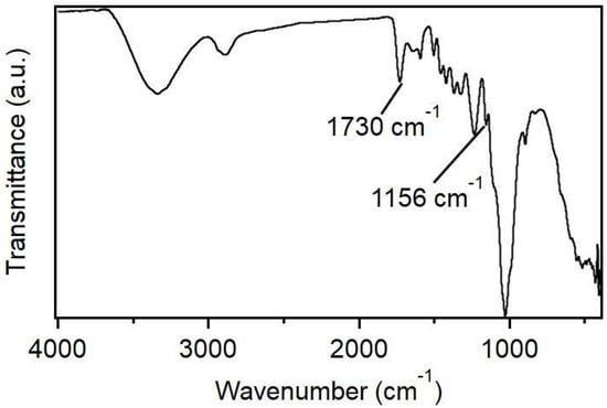 FTIR spectra of the wood after citric acid treatment. FTIR spectra showing characteristic peaks at 1730 (–C=O) and 1156 (–C–O), indicating successful esterification of hydroxyl groups on the wood surface. These modifications enhance the surface charge and hydrophilicity, promoting better ion transport.
