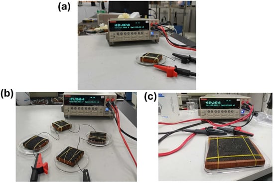Device setup of the wood-based nanogenerator. (a) Single device setup for testing current output. (b) Multiple devices series connected and (c) parallel connected to showcase the scale-up setup.