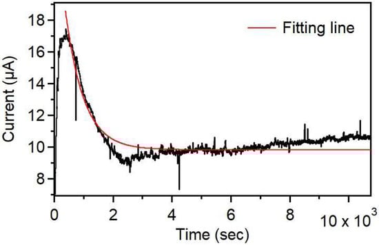 In Figure 7 we show the evaporation-induced electric current vs. time, with data fitting using Equation (8). Figure 7 presents the time-dependent variation of the output current , which is a key performance metric of the system. This analysis highlights the transient behavior and eventual steady-state current, providing insights into how the system responds to the input voltage . Understanding is crucial for validating the model and optimizing system design for practical applications.