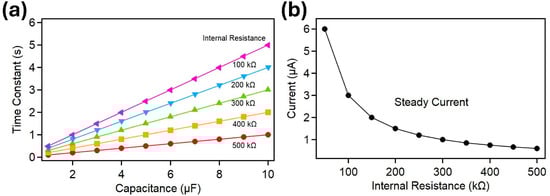 Time constant vs. capacitance and steady-state current vs. internal resistance. (a) The time constant () increases with capacitance () for different internal resistance values (). Higher capacitance and internal resistance result in longer time constants, indicating better charge retention. (b) The steady-state current () decreases with increasing internal resistance (). Lower resistance values lead to higher steady-state currents, demonstrating the importance of minimizing resistance for device performance.