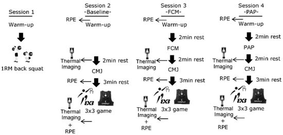 In the first measurement session, the players’ characteristics were recorded, and the one repetition maximum (1 RM) back squat was determined according to the test protocol of the National Strength and Conditioning Association [40]. After this visit, the loads in the PAP and FCM protocols were calculated for each athlete according to the 1 RM. The second session was the baseline protocol, which consisted of a warm-up and a 2-minute rest interval after the warm-up, followed by a countermovement jump (CMJ), a 3-minute rest interval, and then a 3 × 3 basketball game. RPE data were collected before warm-up, after CMJ, and after the 3 × 3 basketball games, and thermal images were collected after warm-up and after the 3 × 3 basketball games. The players completed the FCM protocol in the third session and the PAP protocol in the fourth session after warm-up, and then they were asked to jump and play a 3 × 3 basketball game as in the baseline protocol (Figure 1).