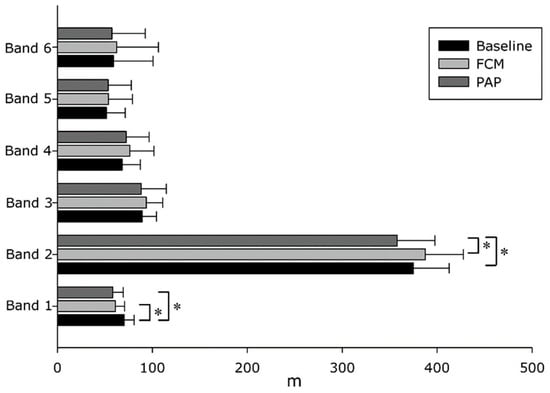 Among the 3 × 3 basketball games played following the different protocols, the highest maximum velocity was after the baseline protocol (average 15.8 ± 1.4 km/h), followed by the PAP (average 15.3 ± 1.3 km/h), and after the FCM (average 15.2 ± 1.9 km/h), respectively. After the baseline protocol, players reached the highest distance in band 1 (after the baseline protocol, FCM, and PAP; average 70.5 ± 10.3 m, 61.1 ± 9.7 m, 58.5 ± 10.8 m, respectively), which was the lowest velocity band (distance covered at 0–<20% of the maximum velocity), and after the FCM, players recorded the highest distance in band 6 (average 62.5 ± 44.0 m), which was the highest velocity band (distance covered at = 100% of the maximum velocity) (Figure 3).