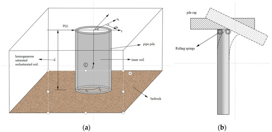 Schematic diagram of the analytical model. (a) Pile–soil interaction system; (b) flexible support at the pile head.