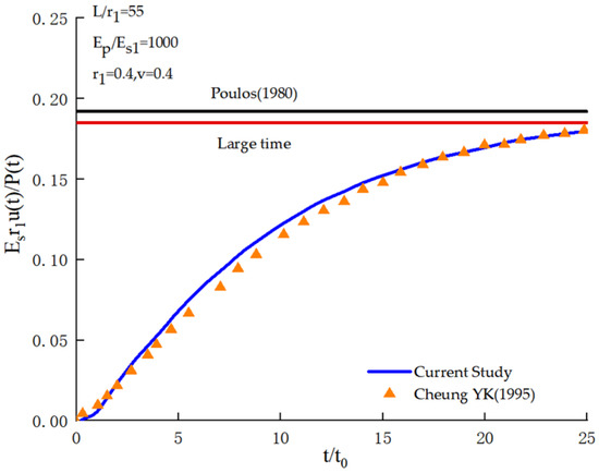 To validate the accuracy of the theoretical derivation presented in this study, specific parameters were assigned: r2 = 10−4 m, kd1′ = kd2′ = 10−1 m2·s−1·Pa−1 and ρf = 0. By approximating the exclusion of pore water effects, the derived solution was simplified to represent a solid pile in a single-phase soil. This simplified solution was subsequently compared with the results of Cheung Y.K. (1995) [15] (Figure 2) and Chang X.M. (2016) [33] (Figure 3). In Cheung Y.K. (1995) [15], a sudden load was applied at the pile head and then maintained at a constant magnitude. As illustrated in Figure 2, the solution derived in this study exhibits excellent agreement with the results reported in [15], demonstrating consistency with the static load limit observed in prior analyses [34]. In reference [33], a cosine-shaped impact load was applied to the pile head.