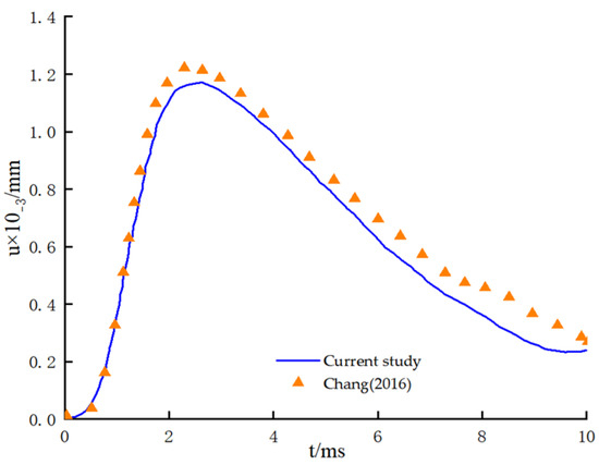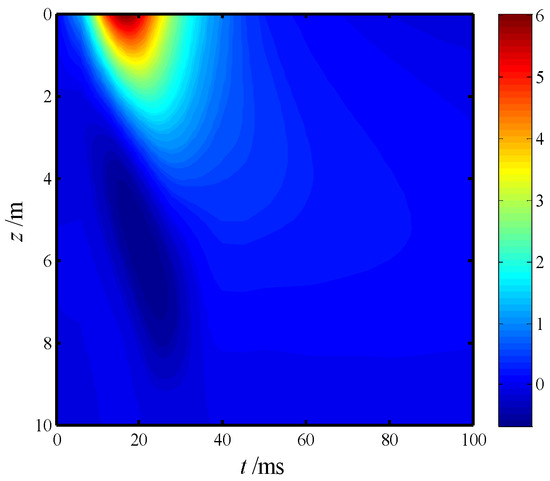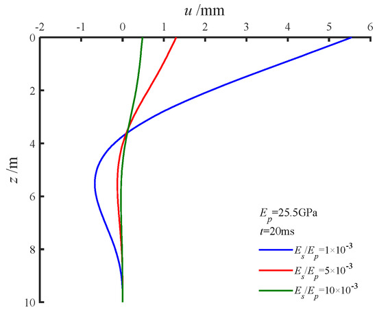 The impulse of the excitation force, denoted as I0, was set to I0 = 1.0 N·s, t0 = 2 ms, L = 7 m, r1 = 0.4 m, ρp = 2.4 g/cm3, υp = 0.28, Ep = 25.5 GPa, ρs = 2.7 g/cm3, υs = 0.35, and . As illustrated in Figure 3, the displacement–time curves derived from the two methods demonstrated excellent agreement. However, during the post-loading phase, the results from reference [9] exhibited slightly larger displacements compared to the calculations presented in this study. This minor discrepancy is likely due to differences in the modeling assumptions and computational methods. Specifically, this study treats the pile as a Timoshenko beam and employs a dynamic Winkler foundation model for analysis, whereas reference [9] models the pile as a three-dimensional viscoelastic body and solves the viscoelastic wave equation using the finite difference method.