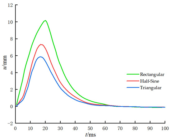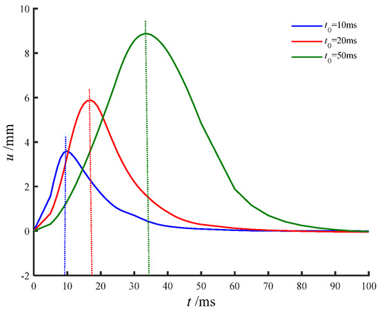 The duration of the impact load applied at the pile head plays a critical role in shaping the structural response. Figure 6 illustrates the effect of varying impact durations on pile head displacement. The results clearly indicate that, for a given impact profile, a longer impact duration leads to a larger peak displacement at the pile head. This behavior reflects the direct relationship between the transverse excitation impulse—represented by the area under the load curve—and the amplitude of horizontal vibrations in the pile. Furthermore, the time at which the pile head displacement reached its peak consistently lagged behind the moment of peak load application. Notably, this lag became increasingly pronounced as the impact duration shortened. The underlying reason for this phenomenon lies in the energy dynamics of the pile–soil system. When the impact duration is short, the elastic potential energy generated by the deformation remains largely undissipated. This recoverable energy temporarily accumulates within the system, leading to a delayed response and amplifying the observed lag effect.