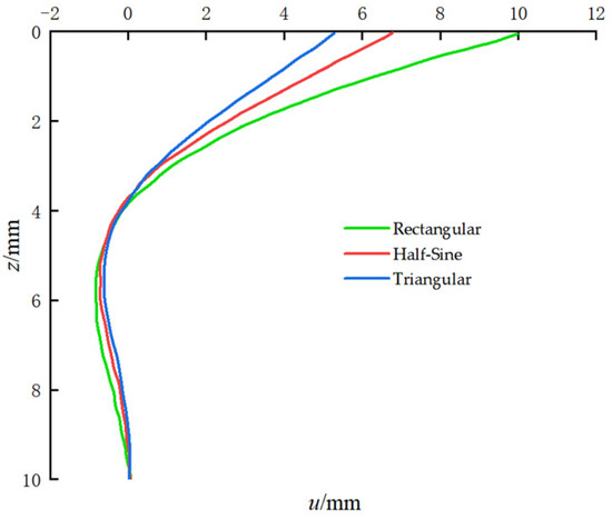 Figure 4 and Figure 5 show the effects of different impact load types on pile head and pile body displacements. All three load types had a duration of 20 ms and a peak load of 1000 kN. The figure shows that, under different impact forms, the pile head and pile body displacements followed consistent patterns with respect to time and depth. The displacement of the pile head increased over time, reaching a peak before gradually returning to zero. The displacement of the pile body decreased rapidly with increasing depth. Among the three types of loading forms, the rectangular impact produced the largest displacement for both the pile head and pile body, the triangular impact resulted in the smallest, while the half-sine impact lied in between.