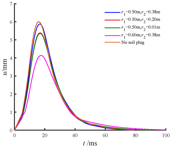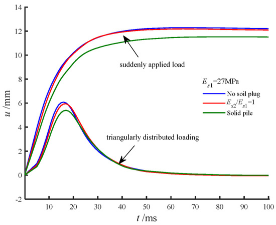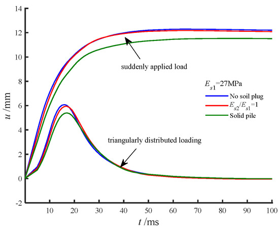 The presence of core soil within the pipe pile significantly reduced the amplitude of the pile head displacement. Figure 7 compares the effects of core soil under triangular impact and sudden step loads. The pile head displacement closely followed the load profile, peaking and then decaying to zero under triangular impact, while stabilizing at a constant value under sudden step loading. The excitation impulse from the sudden step load was twice that of the triangular impact load, resulting in a peak displacement ratio of approximately 2. This highlights the direct correlation between excitation impulse and displacement magnitude.