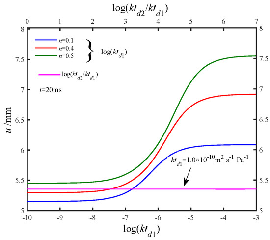 Figure 8 shows the effect of soil dynamic permeability coefficients (kdi’, i = 1,2) on pile head displacement. The lower axis represents kd1′ = kd2′ from 10−10~10−3 m2·s−1·Pa−1, corresponding to Darcy permeability coefficients of 10−6~10 m/s. The upper horizontal axis assumes kd1′ = 10−10 m2·s−1·Pa−1 and kd2′ = (100~107)×kd1′, with t = 20 ms. For discussion purposes, kdi’ = 10−3 m2·s−1·Pa−1 is considered, although real-world values are typically much smaller. The results reveal two stable regions at high and low kd1′, where the pile head displacement remained constant and was unaffected by kd1′. However, at intermediate kd1′ values (10−7~10−5 m2·s−1·Pa−1 ), displacement increased as kd1′ rose. This occurred because higher permeability facilitates pore water flow, reducing its resistance to deformation and amplifying the horizontal dynamic response of the pile. During installation, lateral soil compression decreased kd1′ while increasing kd2′, as loose soil formed around the pile core. The figure also shows that variations in kd2′ had a minimal influence on pile displacement when kd1′ ≠ kd2′. Additionally, lower soil porosity (n) reduced displacement and diminished the effect of permeability, as denser soils with less pore water provide greater confinement, limiting pile movement.