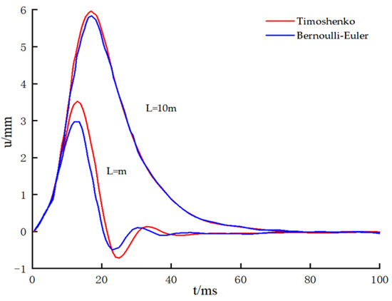 This study employs the Timoshenko beam model, yielding results consistent with those of the Bernoulli–Euler beam model. Figure 10 illustrates the time–history curves of pile head displacement for pile lengths of 2 m and 10 m, as derived from both models. For a pile length of L = 2 m, the stress waves reflected at the pile base induced minor oscillations in the pile head response. In contrast, increasing the pile length to 10 m reduced the influence of the reflected waves, leading to a single-peak response at the pile head. Compared to short piles (2 m) with fixed pile bases, longer piles (10 m) exhibited lower transverse dynamic stiffness, resulting in higher and broader peak amplitudes in the horizontal response. Notably, for short piles, the Timoshenko beam model predicted slightly higher peak and trough response values than the Euler beam model. However, as the pile length increased, the results from both models converged, showing negligible differences.