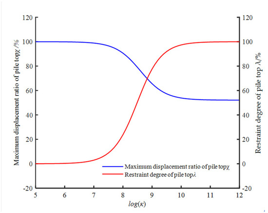 The rotational stiffness к of the pile head under flexible constraints significantly affected the maximum displacement ratio χ and the degree of constraint λ, with a particularly pronounced impact on λ. Figure 16 illustrates the relationship among χ, λ, and к, where к1 = к2 = к. The results indicate that χ and λ remained constant in regions of very low or very high к, signifying minimal sensitivity to stiffness under these conditions. When к < 108 N·m/rad, the pile head behaved as approximately free; conversely, for к > 1010 N·m/rad, it approached a fixed condition. In the intermediate range к = 108~1010 N·m/rad, it decreased from 100% to 50% with increasing к, while λ increased from 0 to 100%, reflecting a transition from near-free to fixed-head behavior.