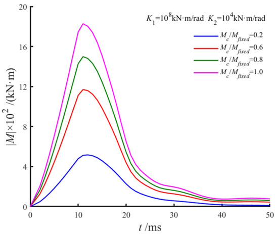 Figure 17 further examines the influence of rotational stiffness on pile head bending moments by analyzing the time history of the moment under various yield moments Mc. The yield moment was set to 0.2, 0.6, 0.8, and 1.0 times the fixed-head moment Mfixed(0,t), maintaining these ratios throughout the analysis. The rotational stiffness was fixed at к1 = 108 kN·m/rad and к2 = 104 kN·m/rad. When Mc(0,t) = Mfixed(0,t), the moment–rotation relationship followed a single-stage linear M-θ model. The results demonstrate that the temporal evolution of the pile head moment closely mirrored the displacement pattern, with an initial rise to a peak followed by a gradual decline to zero. Larger yield moments Mc, which correspond to a greater initial stiffness relative to the rotation range θ, resulted in higher peak bending moments at the pile head. These findings highlight the interplay between rotational stiffness and yield moment in shaping the mechanical response of piles under lateral loading, providing valuable insights into their deformation and stability behavior.