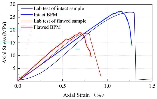 Figure 1 shows the stress–strain curves of intact and flawed samples in the laboratory test and numerical simulation. It is apparent from Figure 1 that the stress–strain curve of the BPM has an obvious similarity with those of the physical test, both in the intact sample and the flawed sample, indicating the models are feasible.