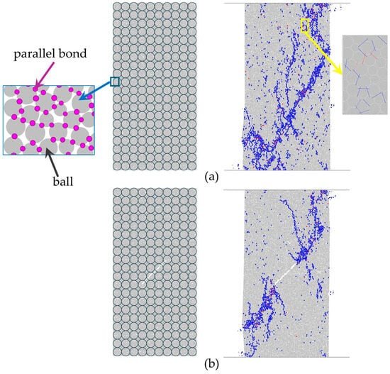 According to the laboratory test results in the paper by Jin et al. [], a set of numerical models were generated by Particle Flow Code (PFC). As a discrete element method, the particles and bonds determine the behavior of the macro material, and it can indicate a similar simulation result in the macro-phenomenon of specimen’s failure []. The particle discrete element model provides support to comprehend the failure process of rock-like material from macroscopic-scale phenomena and statistics. In this paper, the parallel bond was used to generate the bonded-particle models (BPMs).