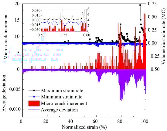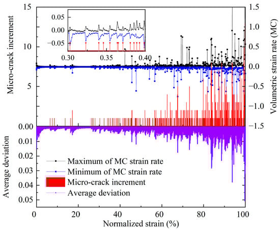 The extremum MC strain rates before the peak stress are plotted in Figure 3. The black curve and blue curve indicate the maximum and minimum value of the strain rate, respectively; the red lines represent the crack increment; and the purple curve represents the average deviation of the strain rate. The bottom axis reflects the normalized strain (from 0% to 100%); and the 100% normalized strain matches the total strain at the peak strength of the intact numerical model.