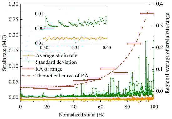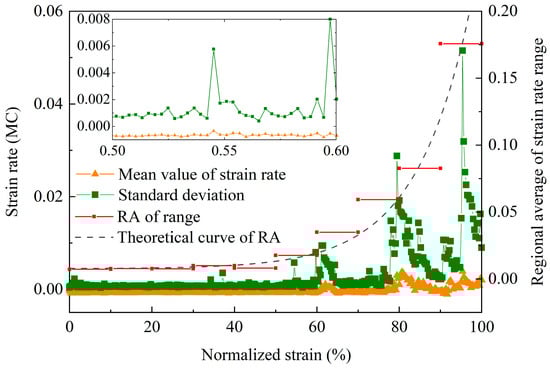 The average, standard deviation (SD), and range RA of the MC strain rate at the pre-peak part of the flawed specimen are shown in Figure 8 (the legends are consistent with Figure 3). The SD of the strain rate field is close to zero before 60% strain and has three peaks between 60 and ~100% strain. The average curve shows the same tendency as the SD curve.