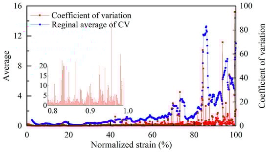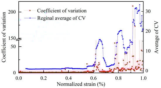 In Figure 9, between 60% and 90% strain, the blue curve has two waves with clear peaks and troughs; meanwhile, the CV curve has fluctuations that appear at intervals. From approximately 87% strain to 100% strain, the last wave on the blue curve has fluctuated upwards higher than ever before. The blue curve shape in case 2 is significantly different from the corresponding curve in case 1. The existence of the flaw has made the variation pattern of the CV and its regional average more regular and more distinguished.
