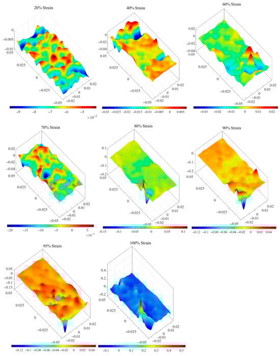 To further analyze the evolution of the MC strain rate distribution during the loading process, eight contour maps of the strain rate field at different moments were investigated, as shown in Figure 6. The Z-axes values illustrate the volume strain rate of each measurement circle. A positive strain rate indicates an increase in volume strain, and vice versa. Under uniaxial compression, negative strain rates are the main component of the strain rate field; however, a positive strain rate might occur in situations such as particle ejection at the edge of the specimen, shear dilation, and tensile failure of bonds.