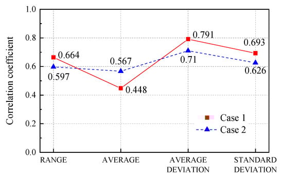 The correlation coefficients between the micro-crack increment and four types of statistics (the range, average, average deviation, and standard deviation) on the MC strain rates have been calculated and plotted in Figure 11. All of the correlation coefficients are positive, which illustrates that the crack increment is positively correlated with the four types of statistics both in case 1 and case 2. Three types of statistics in case 2 are lower than those in case 1, meaning that the existence of a flaw would degrade the correlation between the strain rate field and damage evolution and reduce the dispersion of the strain rate field.