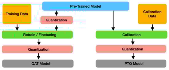 Quantization is recognized as one of the superior schemes in terms of fulfilling excessive memory requirements and computational burden within the DL community. It is well known that 32-bit floating-point data types are adopted in DL algorithms to represent weights. Quantization executes the weights in the form of low-bit width values in place of floating-point values in a more compact way. The term of QNNs is referred to as a special type of CNN, with a growing history of remarkable achievements []. One advantage of QNNs is their ability to speed up network operation and enhance energy efficiency, as quantized weights require less computations. A prevalent trade-off related to QNN is the possibility of losing accuracy due to the incomplete representation of information. This accuracy degradation should be explicitly kept at a minimal level. In the literature, two main methods of quantization exist: post-training quantization (PTQ) and QAT.
