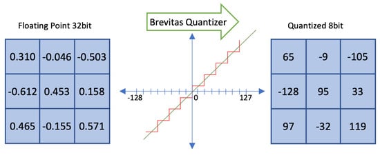 The ultimate purpose of quantization is to explore the optimal trade-off between preserving memory and accuracy degradation. Brevitas has recently been proven as an efficient library, in addition to PyTorch, for quantization by supporting both PTQ and QAT []. Brevitas conserves the functionalities of PyTorch for reduced-precision levels during the training phase. Upon training a neural network, Brevitas supplies a path for transferring the trained network to an intermediate representation ONNX. Diverse numbers of quantized layers are provided by Brevitas to be replaced simply with the layers in a neural network. A numerical example of such quantization is presented in Figure 5.