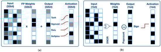 Recent studies, as summarized in the previous section, have revealed that accurate classification can be acquired by using one or two bit numbers for weights and activation operations in convolution layers, instead of using floating-point operations in CNN applications. BNNs stand out with their small memory requirements, low arithmetic precision, high speed, and low energy consumption []. In addition, BNNs are an especially attractive option for implementation on FPGAs because all their operations can be performed in binary. For this reason, a tera-operations-per-second (TOPS) level can be reached in BNN applications on FPGAs. BNNs quantize both the image and the core matrix at (−1, 1) when the convolution process is performed on the CPU through multiplication operations. This quantization is conducted in the range of (0, 1) on the FPGA platform by XNor logic operation. Thus, instead of multiplication during convolution, the XNor gate can be implemented on FPGA in a much faster way. The difference between a convolution operation performed with 32-bit weights and XNOR can be seen in Figure 6.
