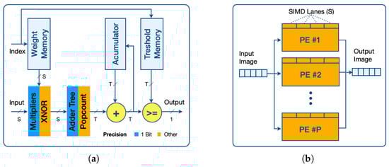 (a) Single processing element (PE) and (b) matrix–vector–threshold unit in FINN framework.
