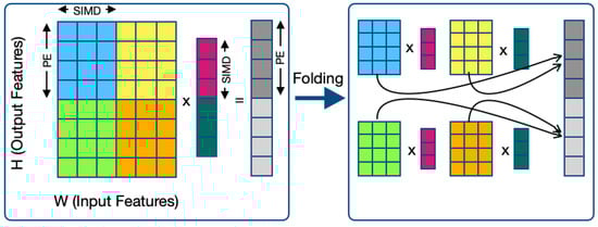 PE blocks perform as many parallel multiplication operations as the number of SIMDs. Increasing this number will result in more parallelism and faster speed, subject to an increased resource usage. The folding transformation is performed by determining the PE and SIMD parameters for each layer of the model. A tensor in FINN is associated with the dimension of NxHxWxC (batch number, height, width, channel). The number of channels (C) is equal to the multiplication of F (folding) and P (parallelization), setting the dimension of a folded tensor to NxHxWxFxP. Another assumption is that PE should be an exact divisor of output attributes and SIMD is an exact divisor of input attributes. PE and SIMD divide the image and weight matrices into pieces and perform multiplication operations separately, with an example of four separate matrix multiplications presented in Figure 9.