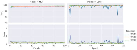 In the first stage, a deep learning network is designed and trained in MLP and LeNet models using Pytorch and Brevitas. The training of the models was carried out on the Google Colab platform with Nvidia Tesla K80 GPU, 12 GB memory and 4.1 TFLOPs running on Linux operating system. When the deep learning models used are created quantitatively with Brevitas, they are divided into many blocks such as multiplication (Mul), subtraction (Sub), multiple thresholding (MultiTreshold), matrix multiplication (MatMul) and normalization (BatchNormalization). While the model created using Pytorch is simpler and consists of only layers, the model created with Brevitas is divided into many components. The present model automatically determines the quantization type based on the weight and activation bit quantization number. For instance, if the weight is 1 bit and the activation is 1 bit (W1A1), the quantization type is binary, while when the quantization parameter is selected as W2A2, the quantization type is integer at the specified bit width. For binary quantization type, the sign(x) activation function is used with thresholding, while the ReLu activation function is used in the integer quantization type. Models created using Brevitas with quantization parameters W1A1, W1A2, and W2A2 were trained with 100 training epochs. In this training phase, accuracy and loss data were recorded and presented in Figure 12. During the backward propagation phase, it is observed that the MLP model consistently increases its accuracy across all three quantization levels, whereas significant spikes occur in the accuracy levels of the LeNet model at the W1a1 quantization level. This phenomenon underscores the need for a higher number of training iterations in the training phase of BNN networks.