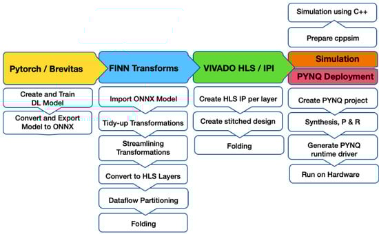 Developed at Xilinx labs, FINN is a framework for building scalable and fast quantized networks on FPGAs. FINN is a powerful tool for synthesizing and implementing the deep learning model designed and trained using Pytorch and Brevitas on FPGAs. The main objective behind FINN-based accelerators is to perform a huge number of classifications per second, rendering it an ideal tool in real-time embedded practices. With the FINN framework, an accelerator for a deep learning model can be designed using four main groups of processing blocks, as presented in Figure 7. In the first phase, a deep learning network is designed and trained using Pytorch and Brevitas. The second step performs the FINN transformations on the model exported into ONNX format, making the network layers suitable for data flow. In the third stage, IP blocks are created on the FPGA using Vivado as well as importing bitstream files into the development environment. The final step includes the acceleration of the network by running the ZYNQ operating system.
