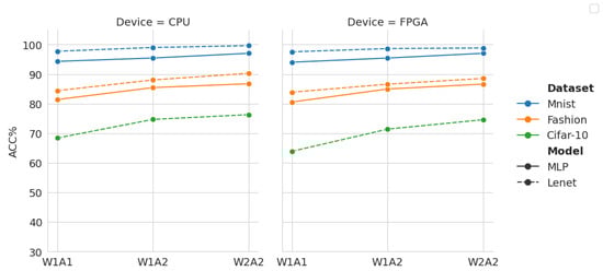 Accelerators developed with three different quantization types for MLP and LeNet models were tested on three datasets of varying difficulty levels: MNIST, FashionMNIST, and CIFAR-10. Figure 15 presents the accuracy levels obtained from the ARM 9 CPU and Zynq 70ZC020 FPGA on the PYNQ Z1.